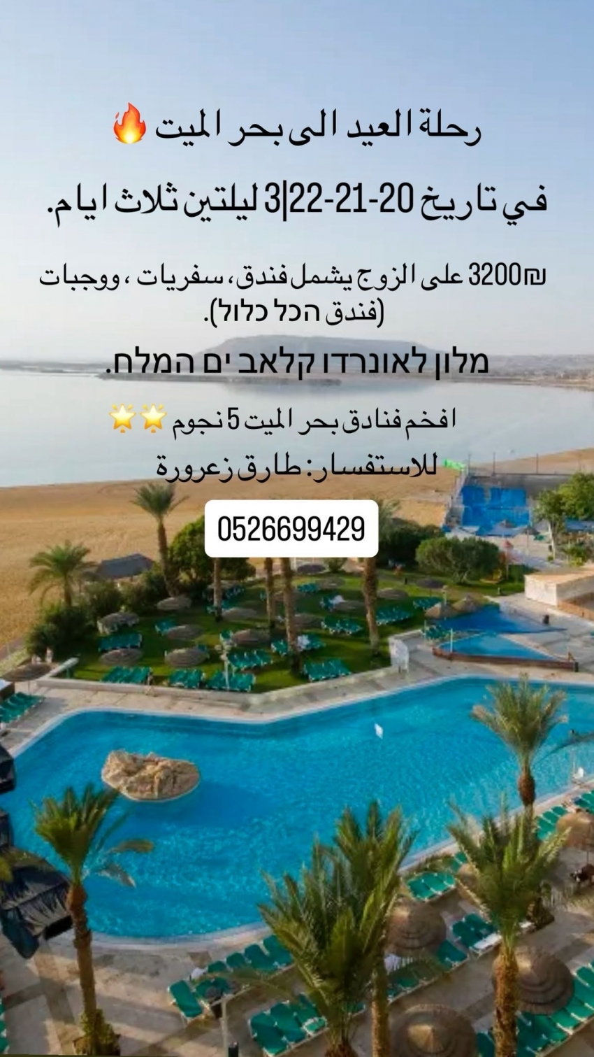 يعلن السيد طارق زعرورة عن تنظيم رحلة استجمام مميزة بمناسبة العيد إلى شواطئ البحر الميت، وذلك في تاريخ 20-21-22 من شهر مارس، لقضاء 3 أيام وليلتين من الراحة والرفاهية.